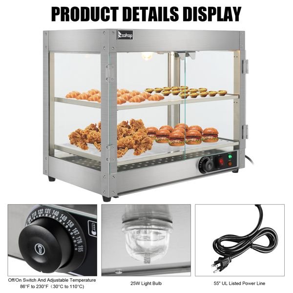 1.[2-Tier Food Warmer]: With two removable shelves for customizable food storage, for maintaining warm food in restaurants, displaying and serving you fresh and warm foods.