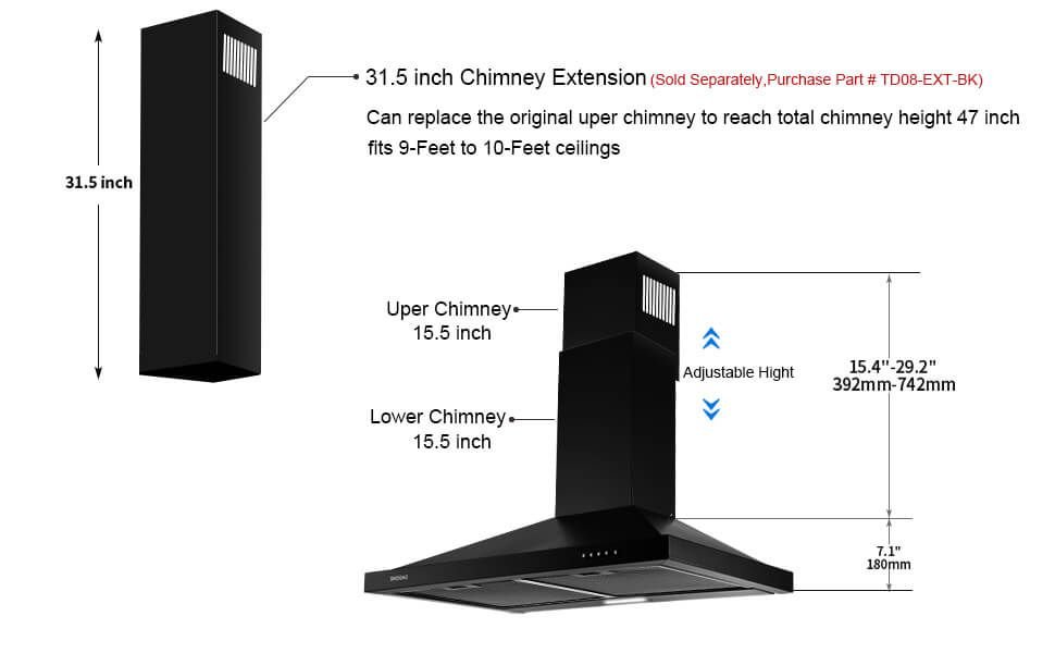 - Adjustable Chimney can fit 7.5-8.5 ft ceiling