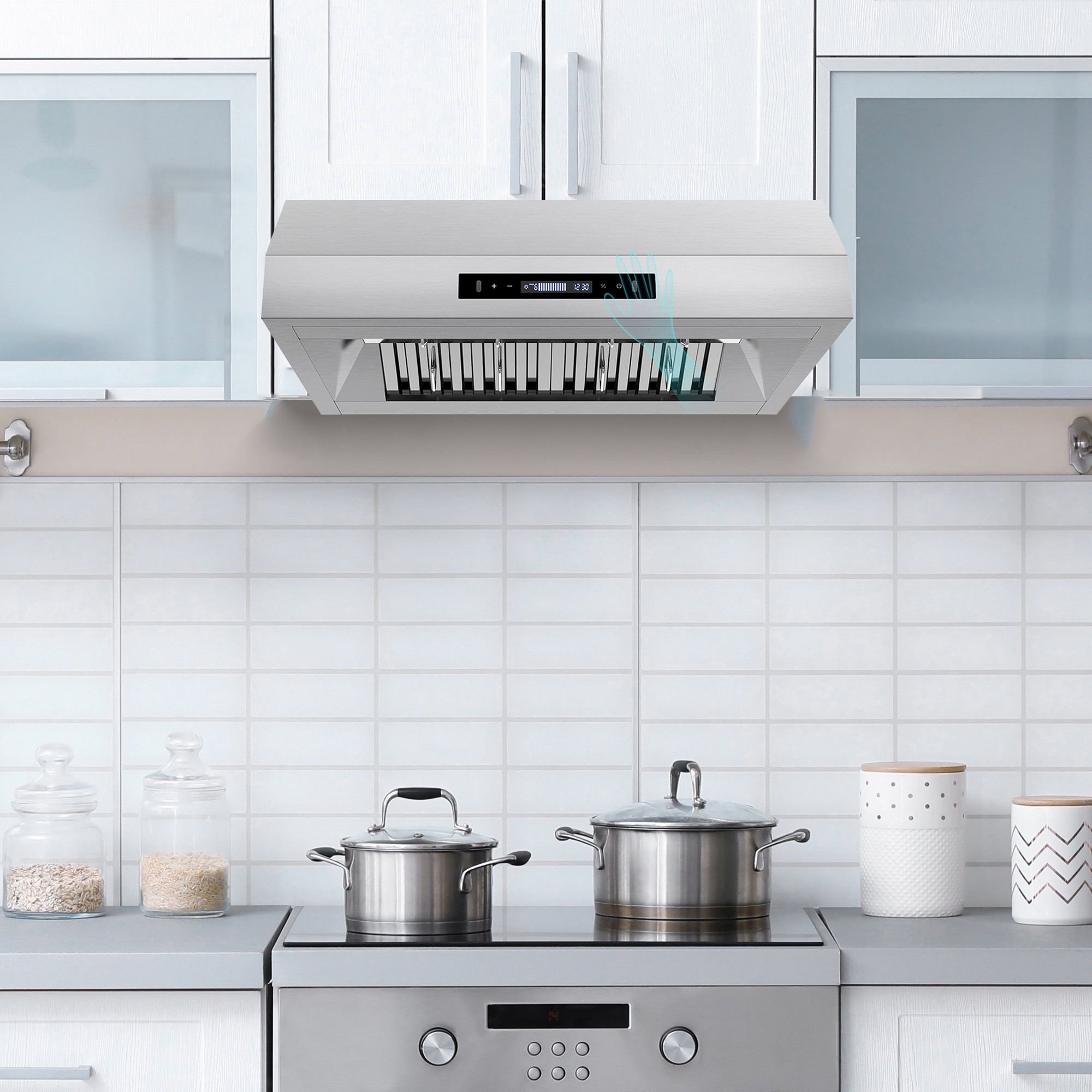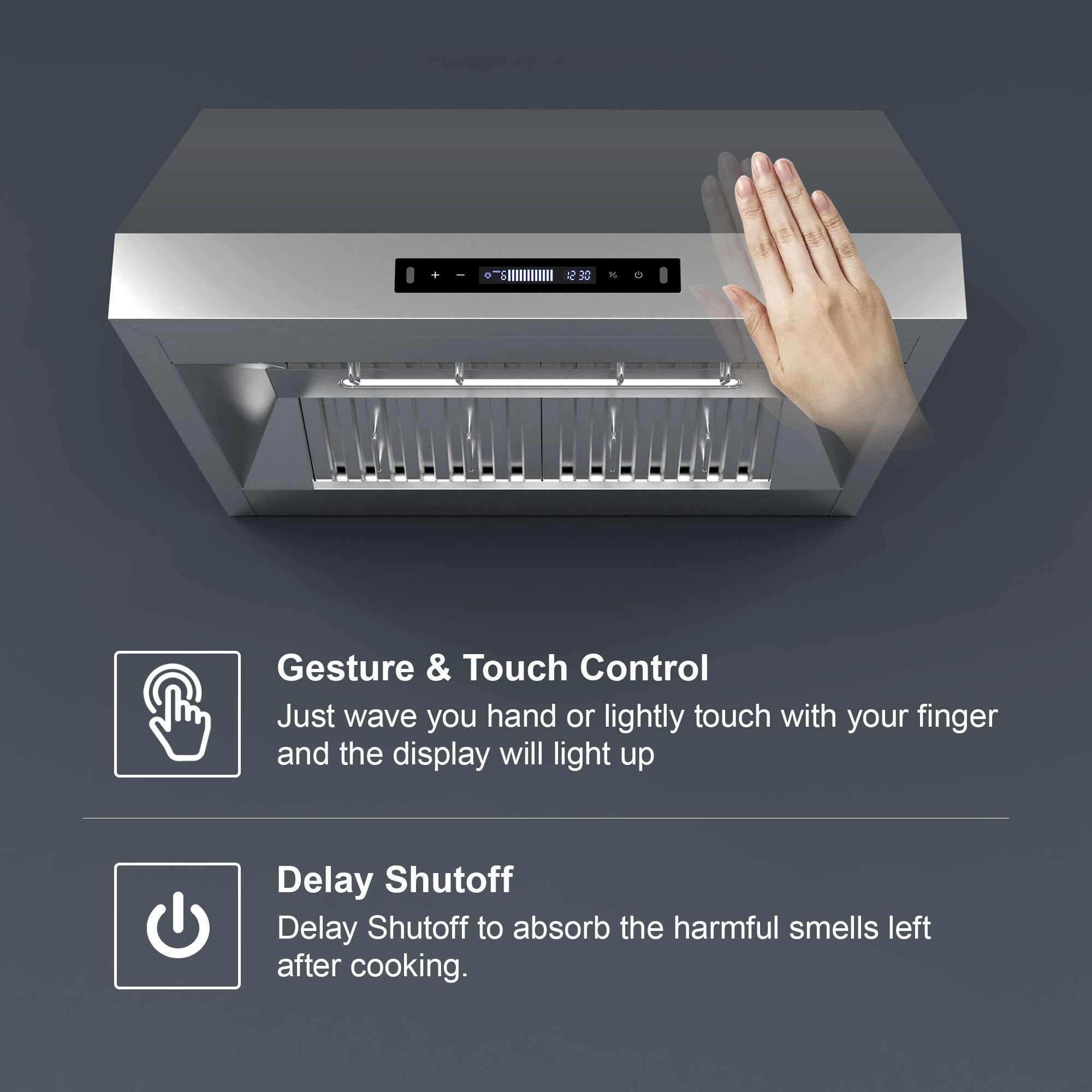 [Gesture & Touch Sensing Control]Vent Hood 30 inch features a easy clean and sleek buttonless gesture sensing & touch control switch panel,just wave you hand or lightly touch with your finger and the display will light up, no need to worry about getting your keys and hands dirty. The kitchen range hood comes with time power off to absorb the harmful smells left after cooking