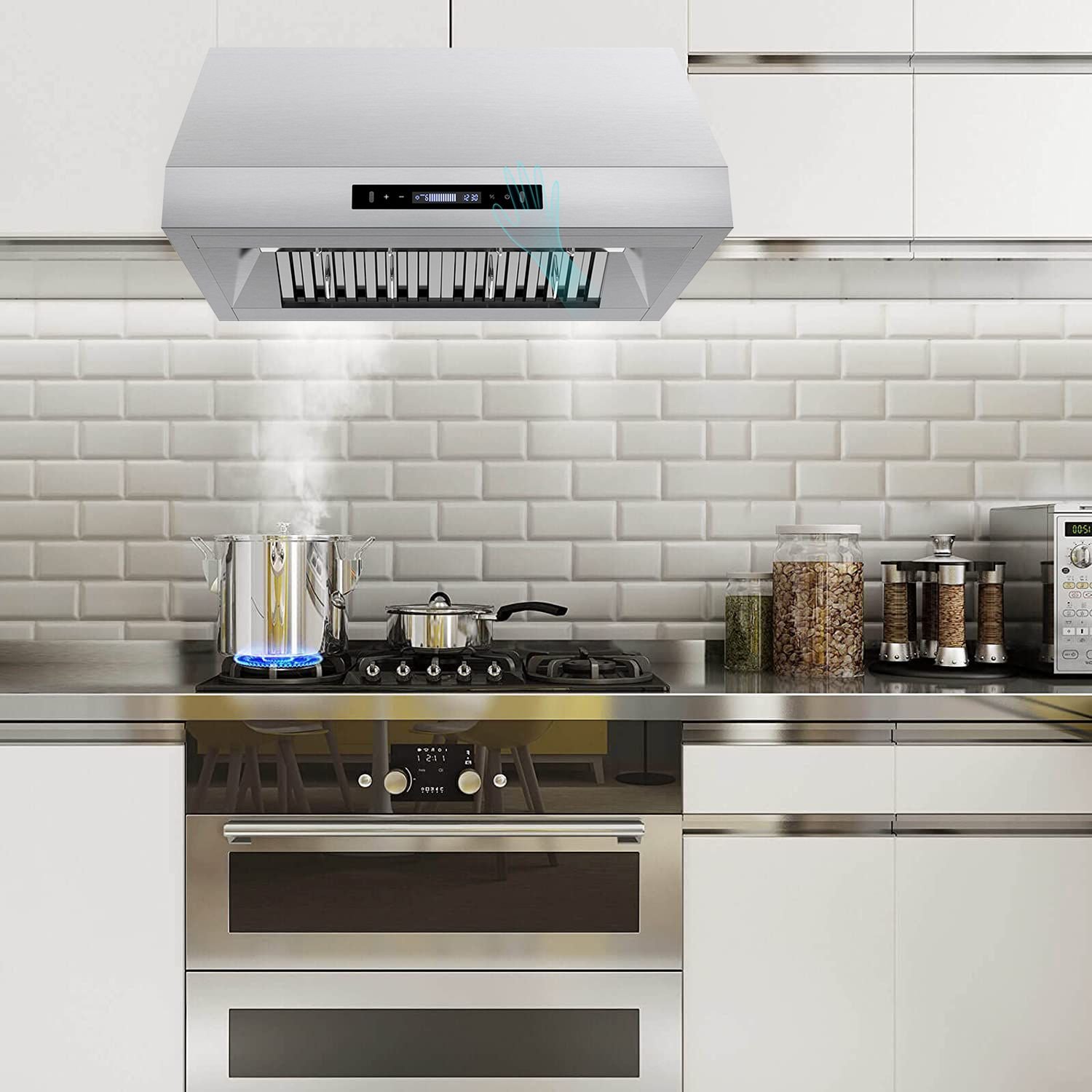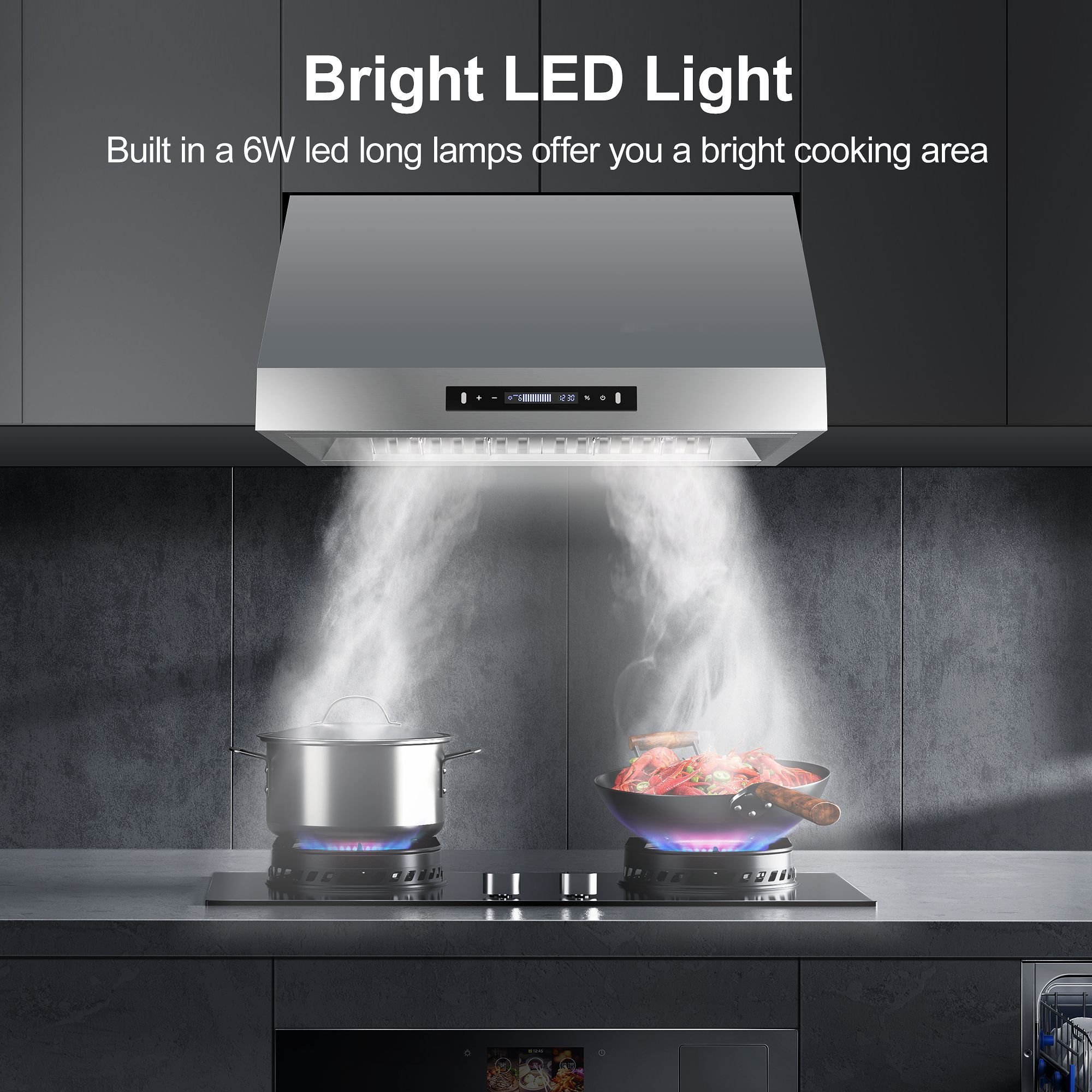 [Deep Cavity Design & 3-Speed Fan]This under cabinet kitchen hood use a deep cavity design to creats negative pressure zones to draw more air and prevent smoke from escaping, suck away obnoxious odors and dangerous fumes with this range hood. Customize your kitchen vent hood with the 9-speed setting, give you more choices according to your cooking ways.