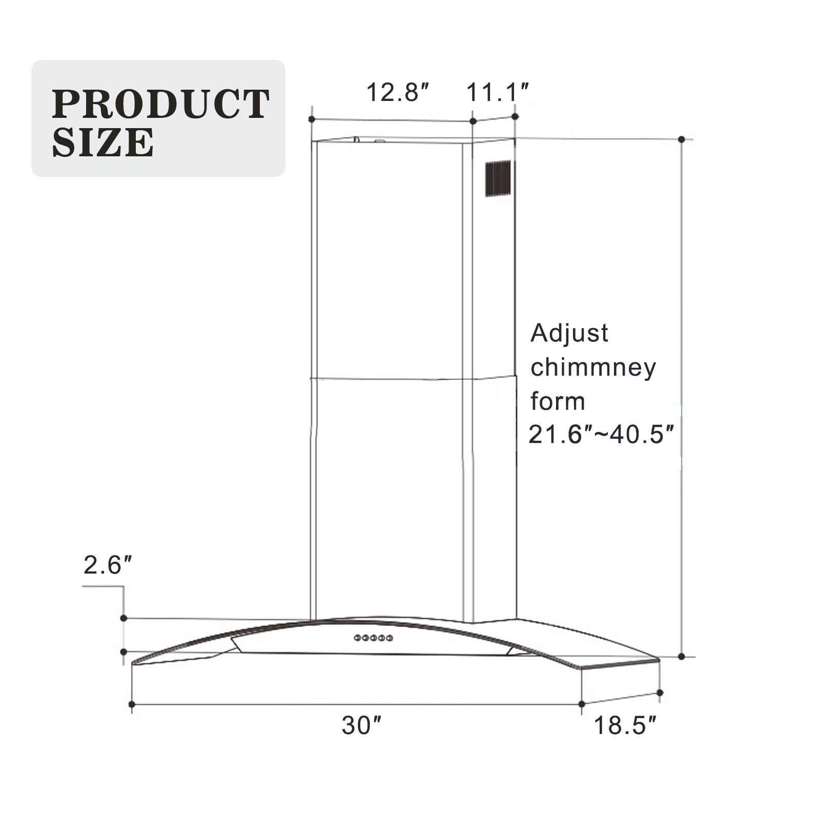 Dimension: 29.5" x 18.5" x 40.5"Chimney Height: Telescopic Chimney Fits 8ft to 9ft ceilingVenting Size: 6" round duct vent exhaust and back draft damperAirflow at Max: 700 CFMLighting: 2 X 1.5W LED LightsNoise Level: 55 dBAVoltage: 120v / 60 Hz standard USA & CANADAMotor: 200W Single Chamber Ultra QuietMount Type: Wall MountSpeeds: 3 SpeedGlass: 6 mm tempered glassKeypad type: Touch control panelFilters: 2  Stainless steel baffle filtersMaterial: Industry Highest quality 430 Stainless SteelCertified: ETL  U.S. & Canada CertifiedWith Oil Cup