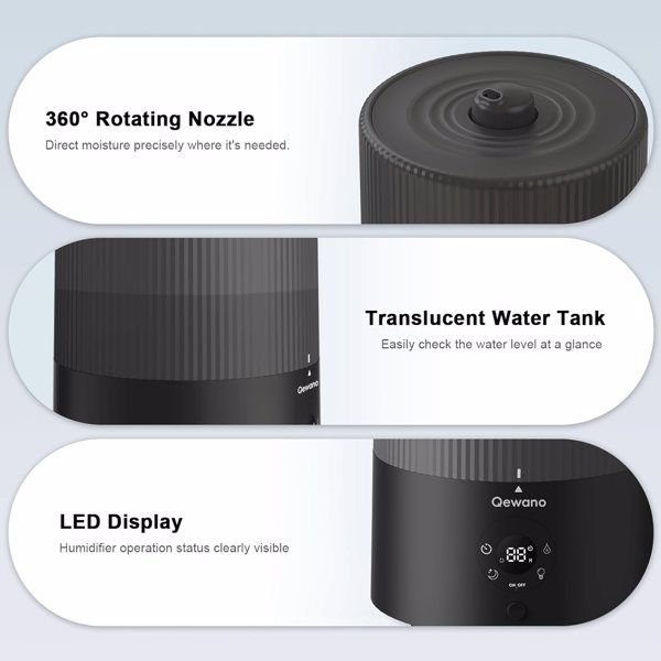 • [Use with confidence]The easy to clean humidifier features a 360° rotating nozzle, allowing for effortless adjustment of the mist direction to balance indoor humidity. It automatically shuts off when water reaches a low level, avoiding potential risks and damage. Rated as low as 18 watts, humidifier large room can run continuously, and the energy-efficient design keeps the monthly electric bill under $7.