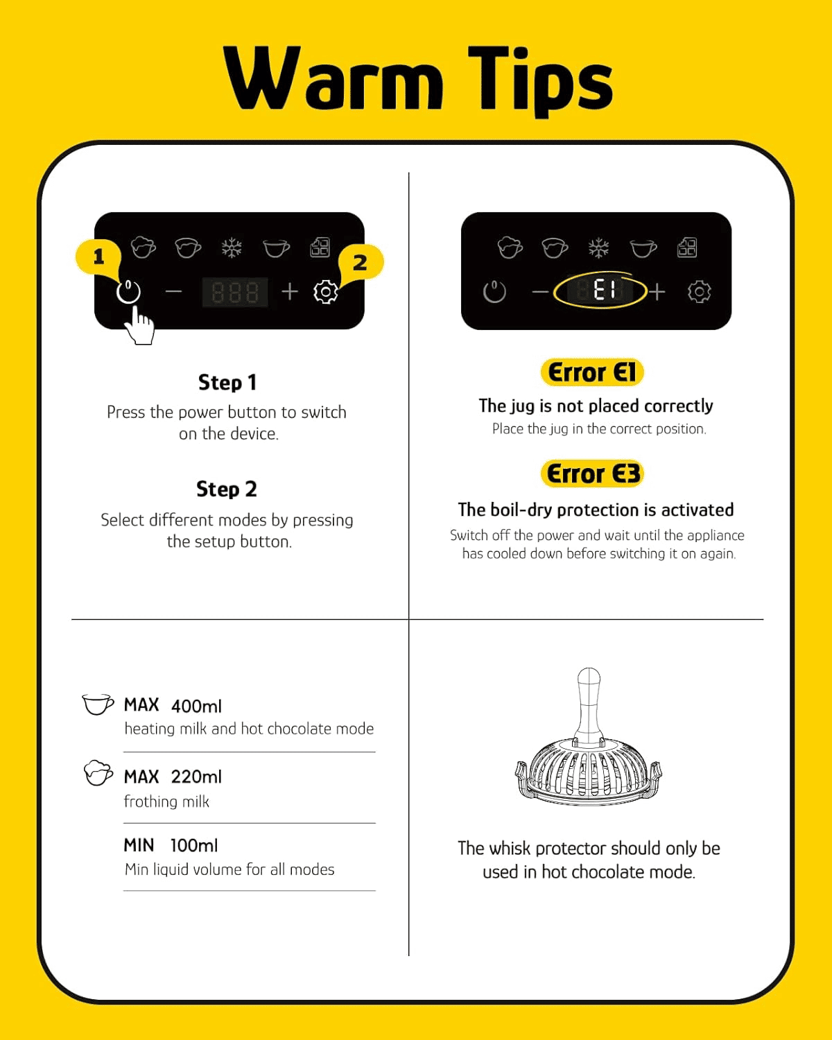 4. Adjustable temperature and thickness, LED touch control, cold and hot foaming, 5-in-1 function, dishwasher safe.