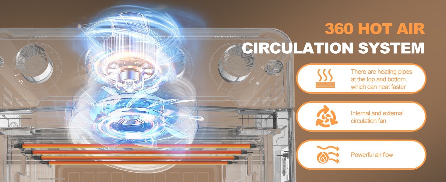 1.Family size&Space saving design: 26QT, 3 rack levels allow you to prepare family-size meal for up to 10 people at once, or control how fast and crispy your food cooks. With a large design this air fryer oven can be placed on your countertop or stored away when not in use.Air fries up to 5 lb of food,Toasts 6 slices of bread.