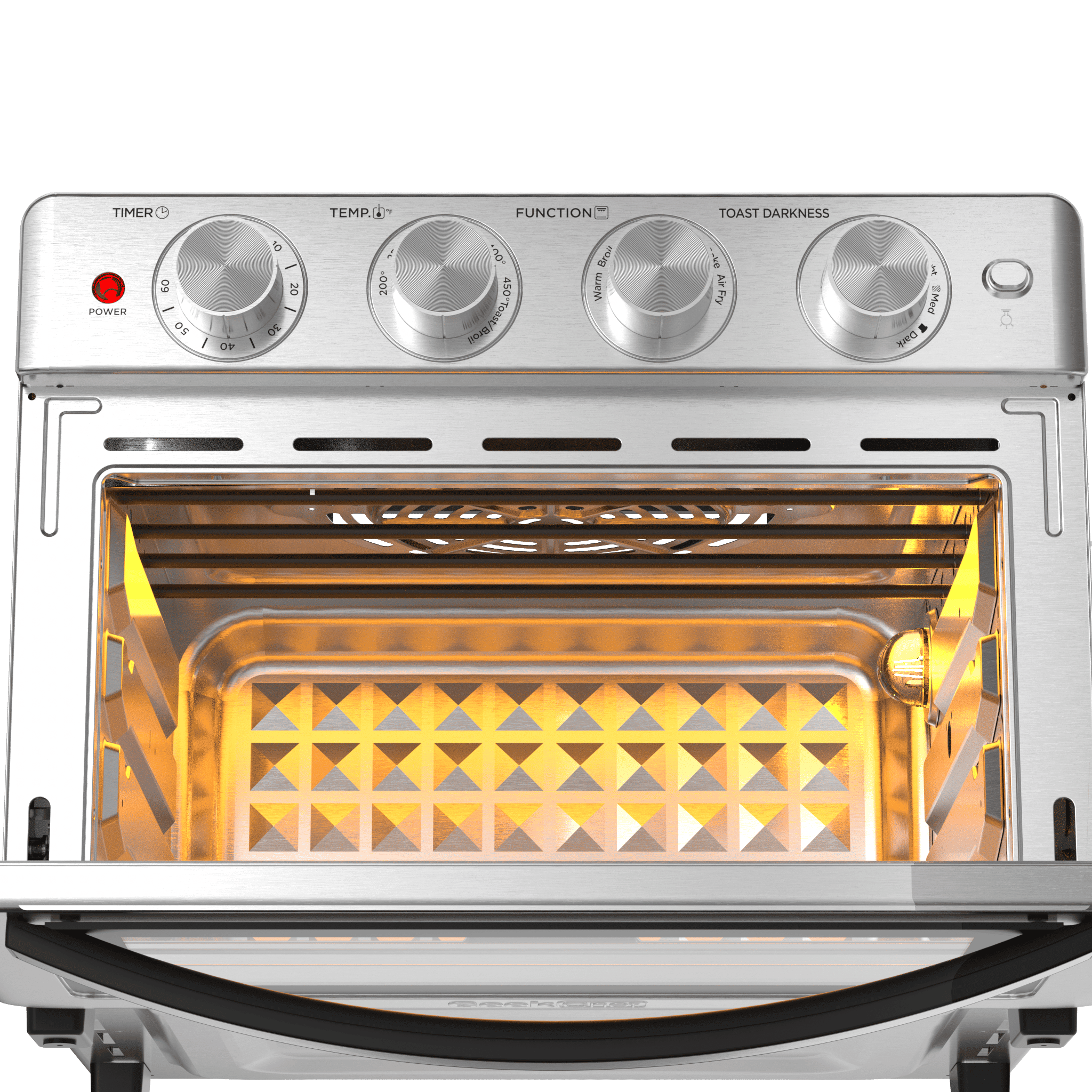 2.Healthy,Fast,Powerful:ETL listed for safety, 1700W strong Power makes super Efficient to cook food in the Healthiest way by cutting over 85% of fats. Equipped with a large glass viewing window and inner oven light, make it easy to monitor cooking progress.Brushed Stainless Steel exterior enhances any kitchen decorate.