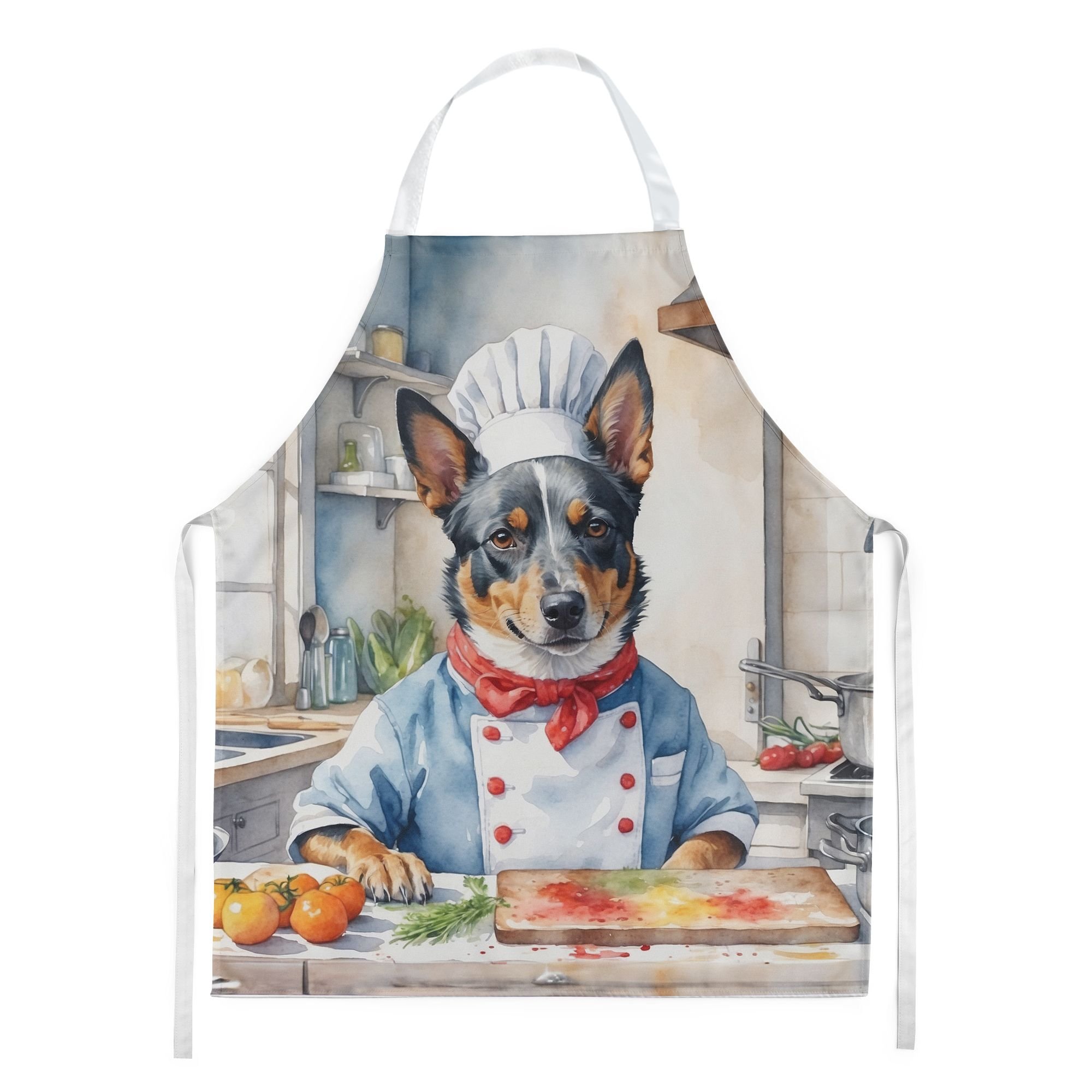Apron featuring breed specific Australian Cattle Dog artwork. Elevate your cooking, baking, and grilling experiences with our versatile Kitchen or BBQ Apron. This Bib Style apron isn't just limited to culinary activities - it also serves as an excellent baking apron, artist apron, server apron, gardening apron, or even a dog grooming apron. The apron showcases vibrant full-color artwork contributed by one of our talented artists, bringing a dash of style to your daily tasks. With dimensions of approximately 27"W x 30"H, it provides ample coverage to protect your clothing from spills and splashes. Our apron is meticulously crafted from 100% Ultra Spun Polyester, known for its durability and lightweight nature. The apron comes with white tie straps, ensuring a comfortable and adjustable fit for all. It's a perfect choice for kitchen apron enthusiasts, whether you are a woman or a man. Designed for easy maintenance, this apron is fully machine washable. The quick-drying polyester material actively reduces staining, keeping your apron looking fresh and new for longer. Our beautifully designed apron isn't just a functional kitchen accessory - it's a fashion statement in the culinary world!