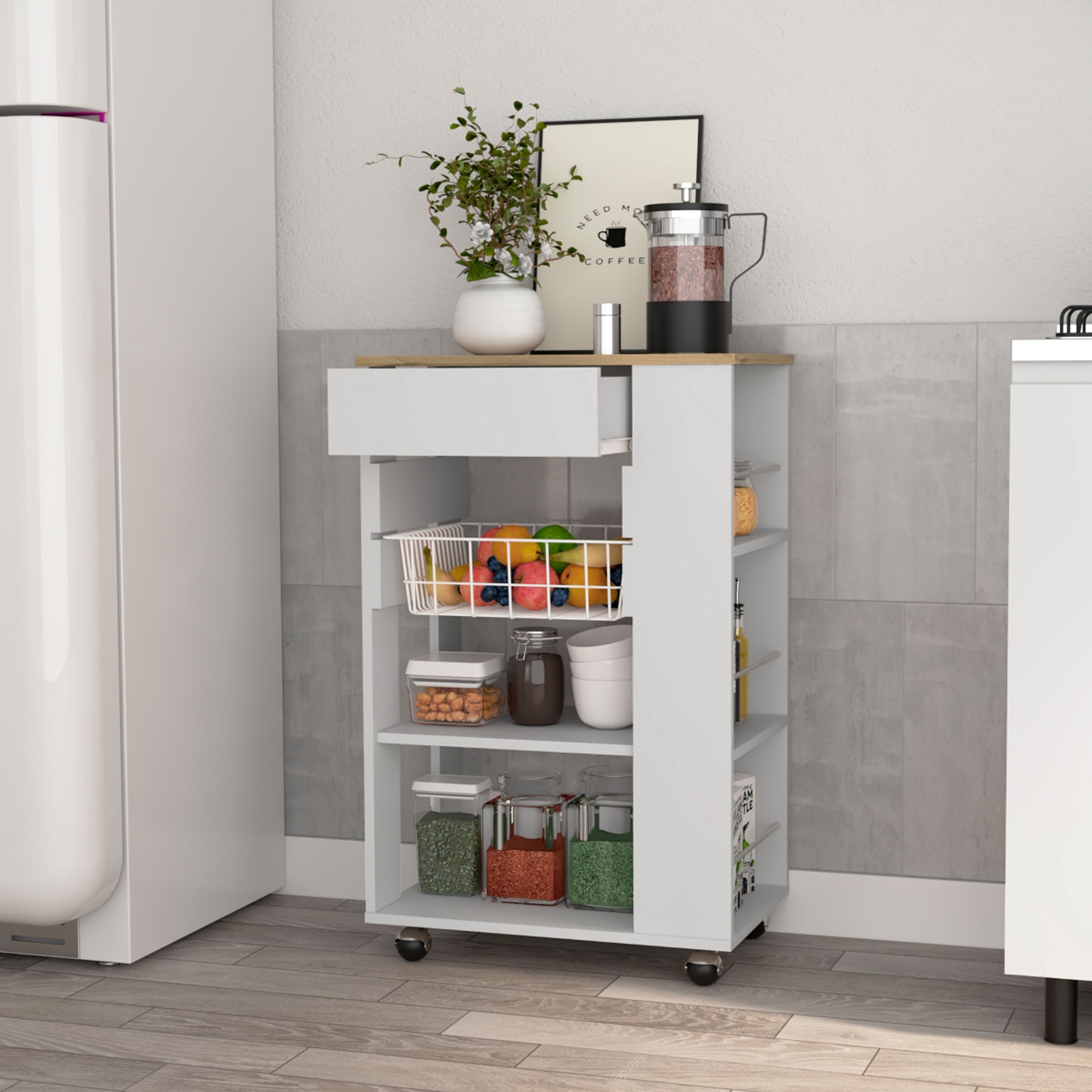 Blosson Kitchen Cart, One Drawer, Two Open Shelves, Four Casters -White / Light Oak