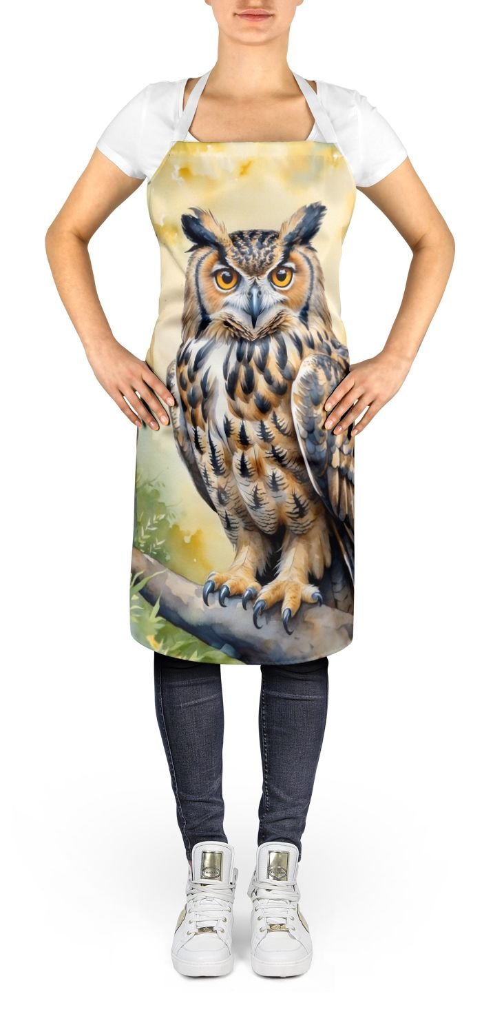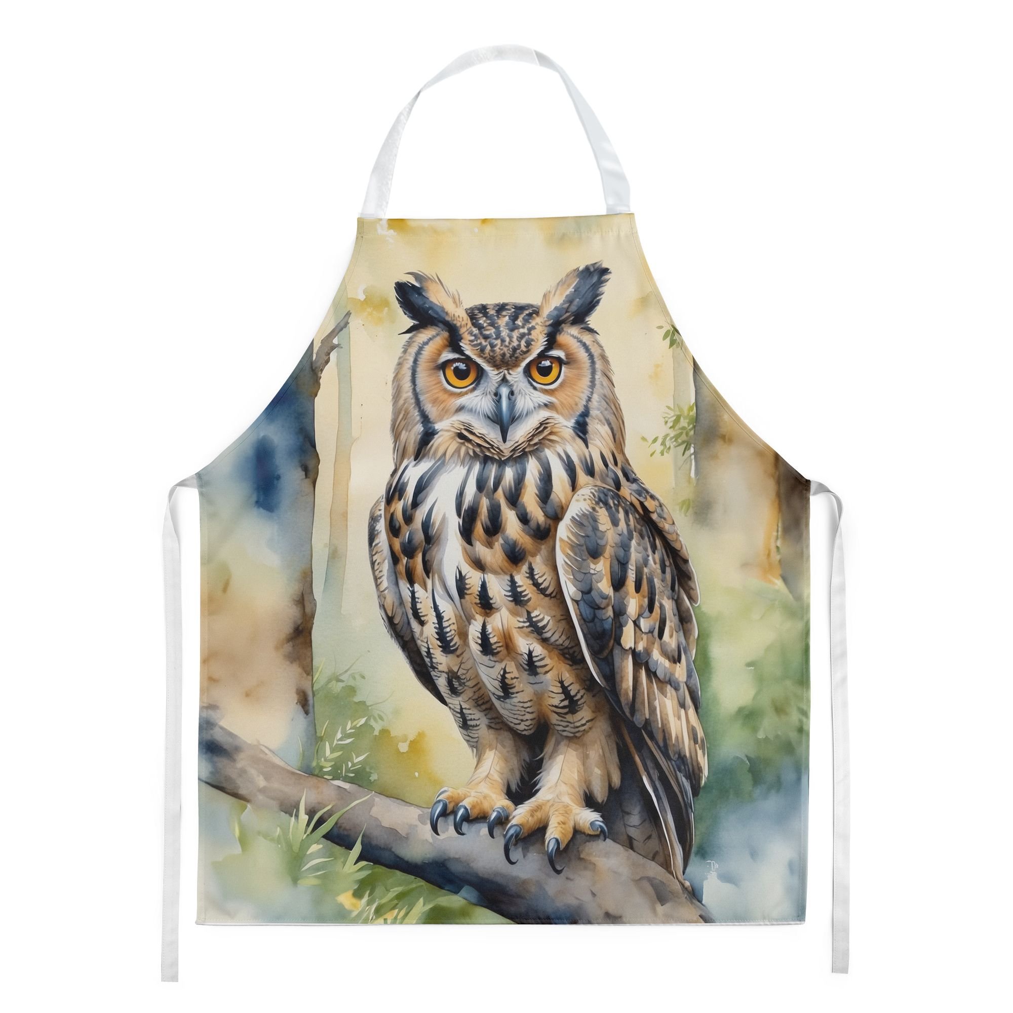 Apron featuring breed specific Eurasian Eagle Owl artwork. Elevate your cooking, baking, and grilling experiences with our versatile Kitchen or BBQ Apron. This Bib Style apron isn't just limited to culinary activities - it also serves as an excellent baking apron, artist apron, server apron, gardening apron, or even a dog grooming apron. The apron showcases vibrant full-color artwork contributed by one of our talented artists, bringing a dash of style to your daily tasks. With dimensions of approximately 27"W x 30"H, it provides ample coverage to protect your clothing from spills and splashes. Our apron is meticulously crafted from 100% Ultra Spun Polyester, known for its durability and lightweight nature. The apron comes with white tie straps, ensuring a comfortable and adjustable fit for all. It's a perfect choice for kitchen apron enthusiasts, whether you are a woman or a man. Designed for easy maintenance, this apron is fully machine washable. The quick-drying polyester material actively reduces staining, keeping your apron looking fresh and new for longer. Our beautifully designed apron isn't just a functional kitchen accessory - it's a fashion statement in the culinary world!
