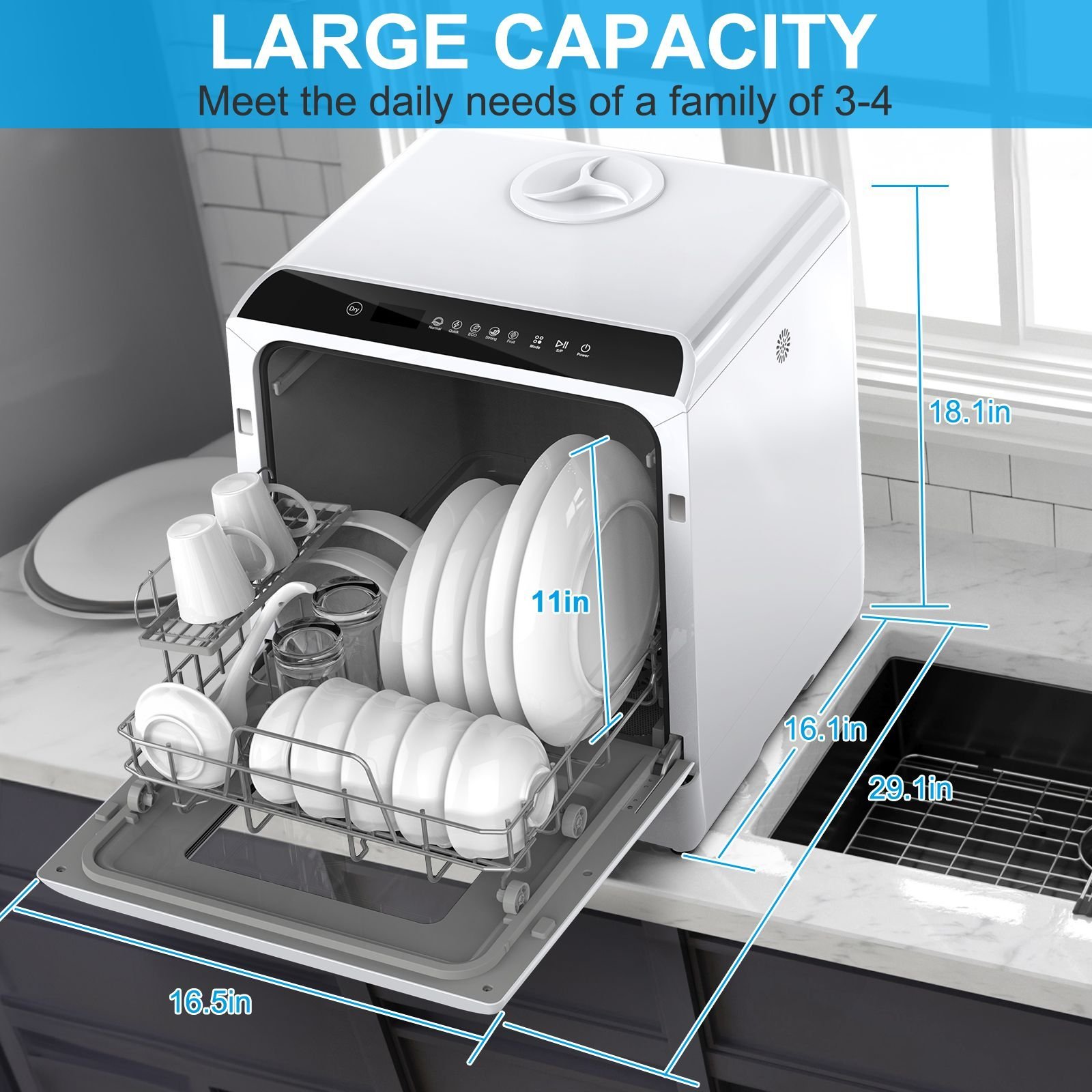 3.Compact & Large Capacity: The size of the compact dishwasher is 16.7"D x 16.9"W x 18"H Inches. You can put it on any table or shelf. After putting in the dishes of a family of three, you can enjoy parent-child time more. It is a tabletop dishwasher, dryer, and cabinet.