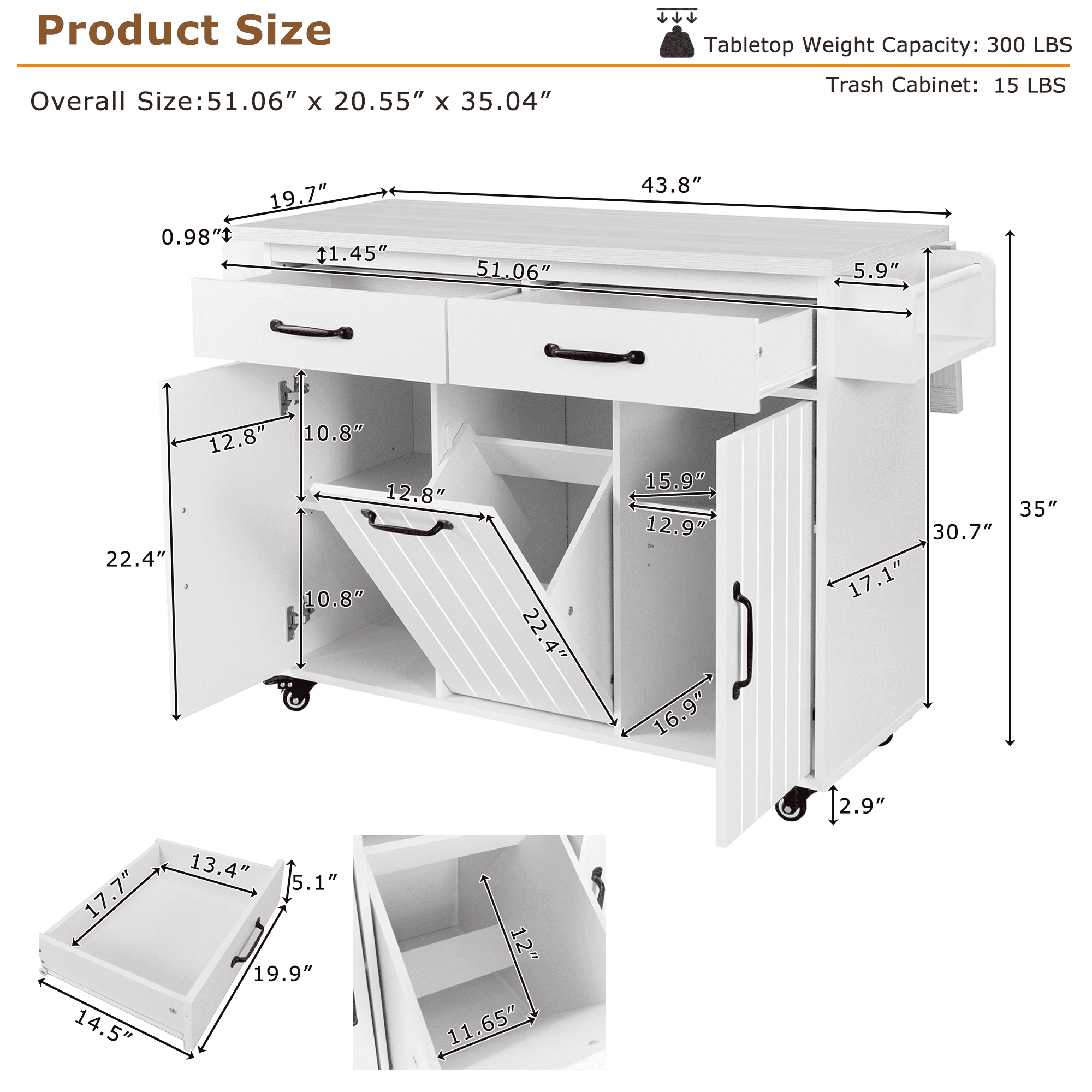 | Highlights | [Ample Storage Space][Drop Leaf][Multipurpose Tilt-out Trash Can][Adjustable Shelf][5*360°Smooth Rubber Wheels][Stationary Cabinet Feet][Towel Rack][Spice Rack][Two Doors + Two Drawers][Metal Hinges] |
