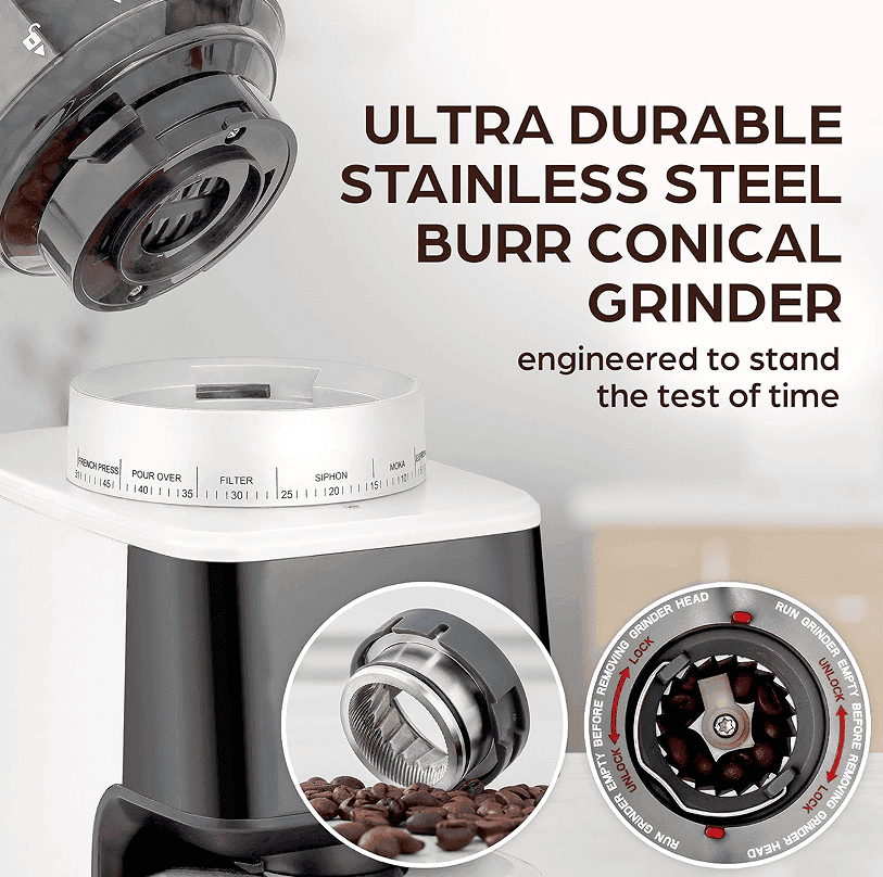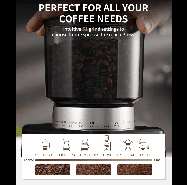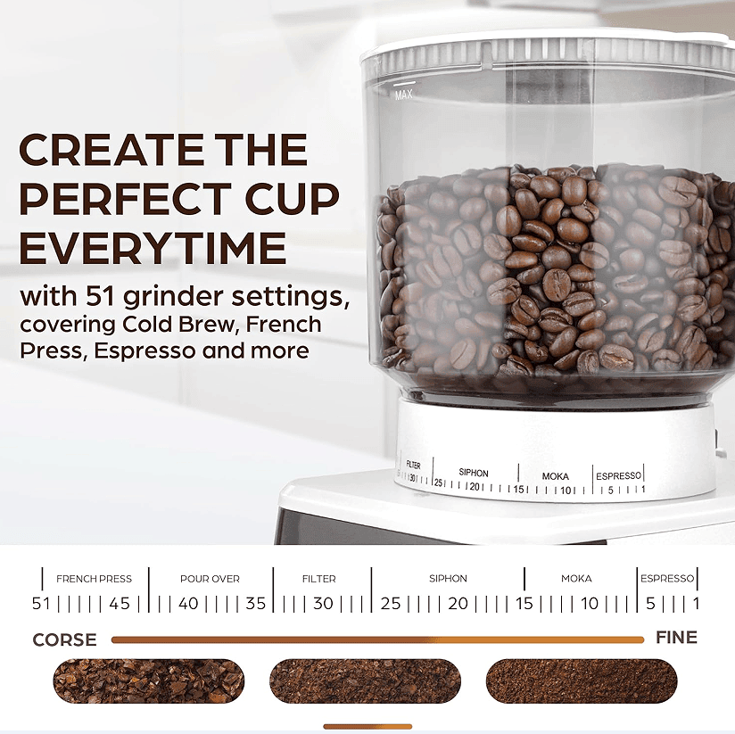 • 51 grinding settings from French press coarse to Espresso to Turkish fine,