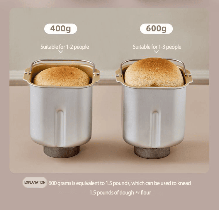Capacity: 1.0 Lb (500g), 1.5 Lb (750g) and 2.0 Lb (1000g)