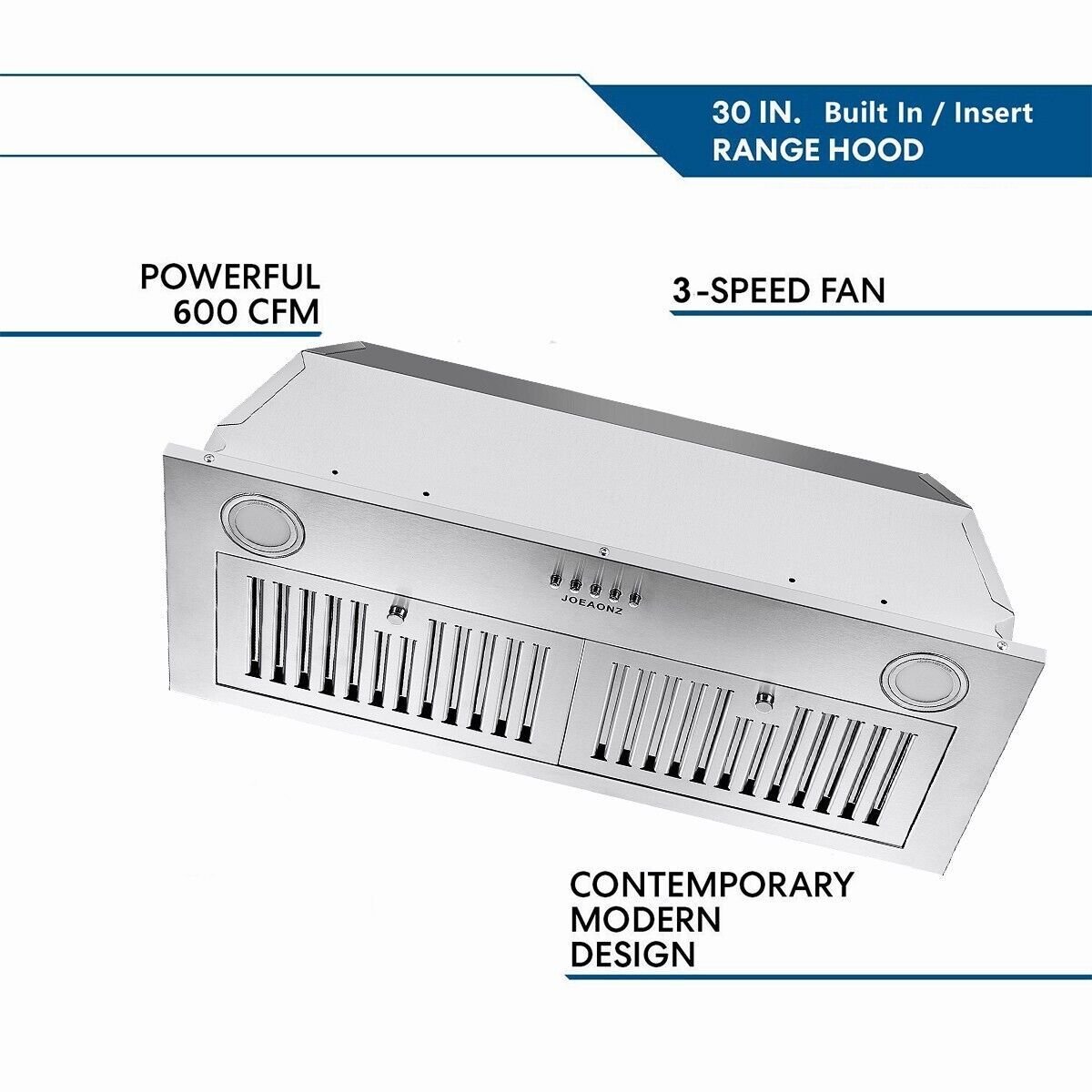 Style: Insert Range Hood This 30-inch insert kitchen range hood has 600CFM airflow; modern style and practicality. Made of high-quality stainless steel. The mechanical push-button control creates a focal point with a classic appearance. 2 pcs removable; dishwasher safe; easy-to-clean stainless steel baffle filters under the range hood; which can capture oil particles and keep the kitchen fresh. 2 pcs bright LED lights shine on your kitchen for better cooking experience. For pipeless recirculation installations; a charcoal filter kit (sold separately: CFZMG02) is available.