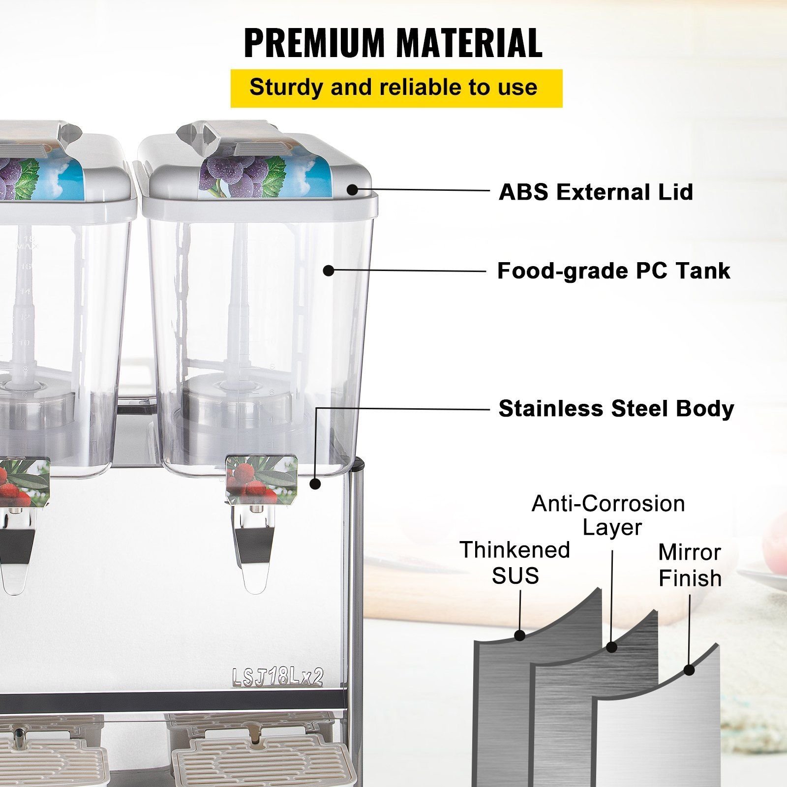1.VEVOR 110V Commercial Beverage Dispenser; 9.5 Gallon 36L 2 Tanks Juice Dispenser Commercial; 18 Liter Per Tank 300W Stainless Steel Food Grade