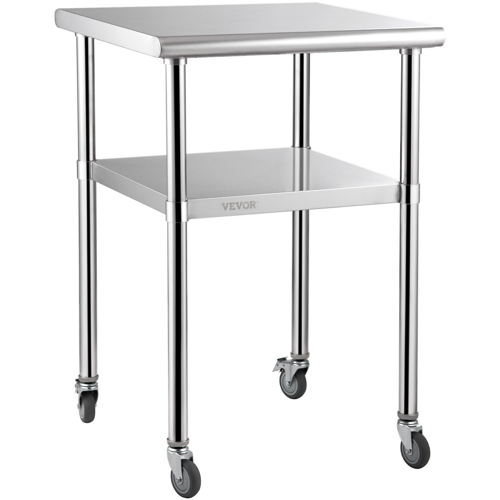 - All parts of our commercial food prep table are made of stainless steel for all-range rust resistance. Its thickened tabletops with upgrade density boards can hold up to 600lbs of heavy items. The adjustable undershelf holds various sized objects. In addition, it contains 4 universal casters (2 with brakes) for high mobility. This VEVOR work table is a professional kitchen storage tool and work assistant that saves you time and space. Get ready to cook and prep without the headache.