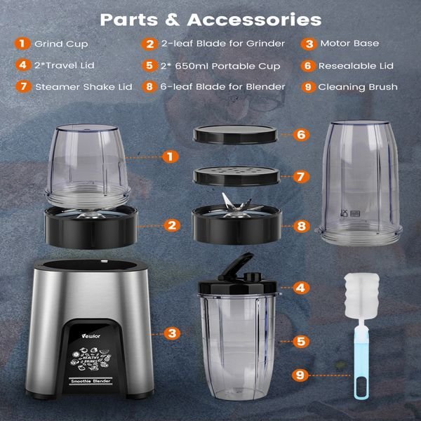 [Multifunctional Smoothie Blender] With a 1000W powerful motor; VEWIOR personal blender for shakes and smoothies for fast mixing. The 6-leaf blade can be used for smoothies; juices; shakes; baby food; ice cream; and protein drinks. The 2-leaf blade can be used for coffee beans; spices and nuts. It is very useful for grinding roasted coffee seeds into powder to make fresh coffee.